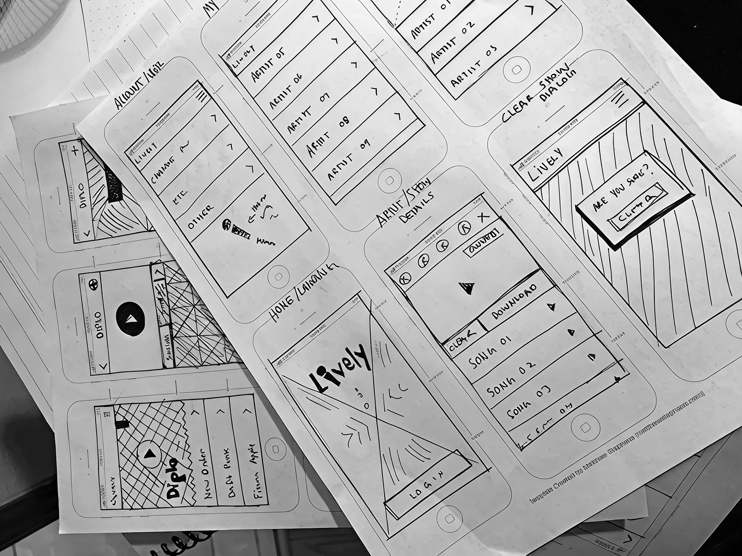 Before moving into digital wireframes, I began with low-fidelity hand sketches to quickly explore feature ideas, user flows, and screen layouts for the Lively mobile app. This stage allowed me to: